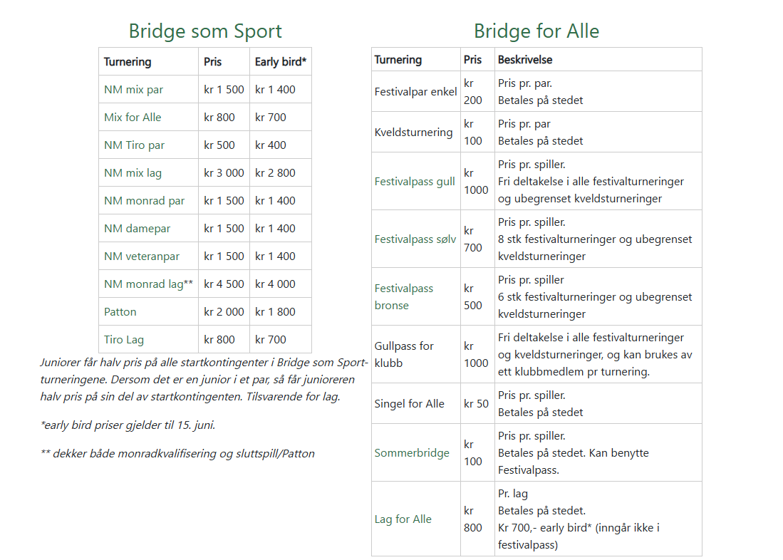 Bridge som Sport koster mer enn Bridge for Alle. Skal du spille mange Festivalturneringer, lønner det seg å kjøpe Festivalpass.